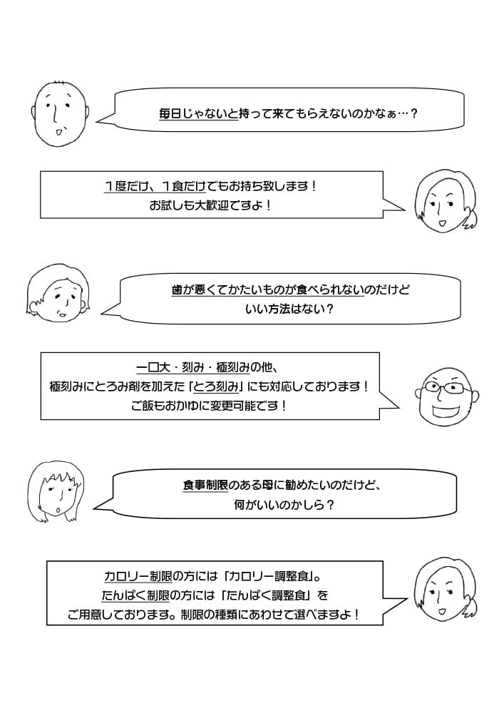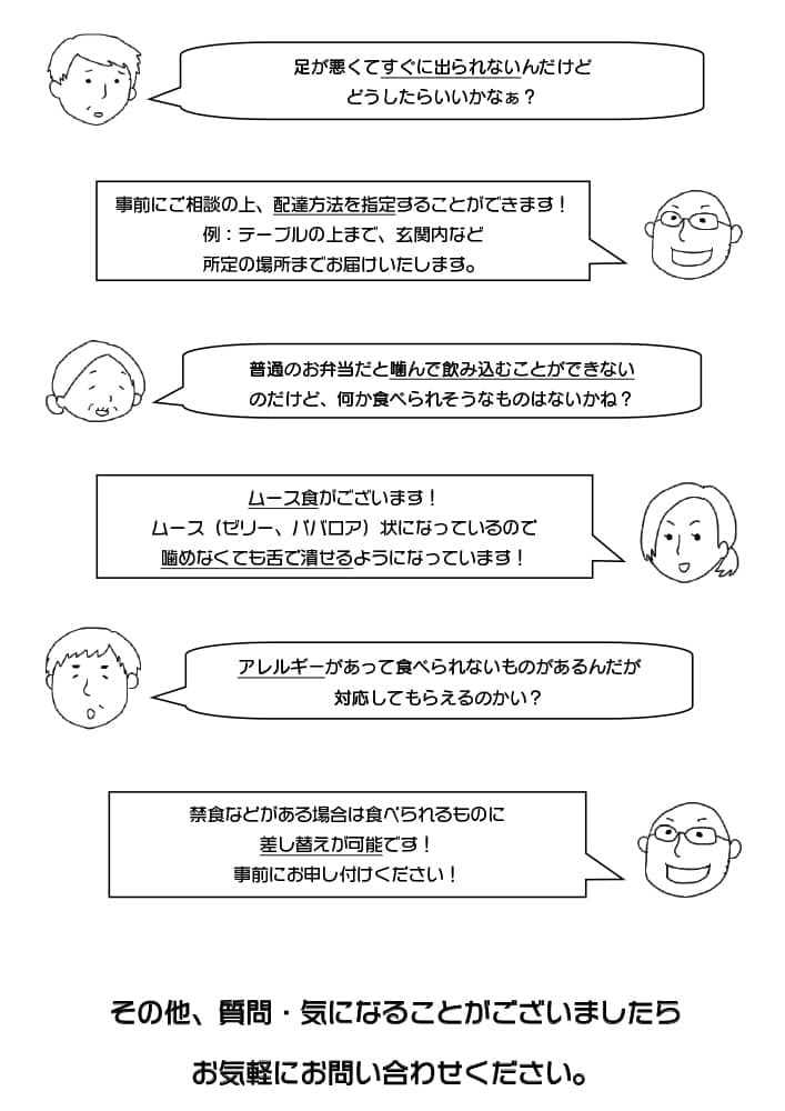 おかゆ、アレルギー、きざみ食希望など、特別なご希望がございましたら、お伝えください。